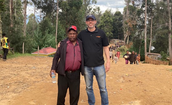 In the course of raising awareness for the Enga New Testament dedication, we drove to the summit of a mountain range near Wabag town, ascending to an altitude of 8,600 feet. We then drove across the ridge and down the other side of the mountain, stopping at each village along the way to tell people about the upcoming Enga New Testament dedication. As we stopped in the village of Tole, I was suddenly overcome by the incredible significance of me being there together with Pastor Timothy Pesone, the Enga Bible translation committee chairman, who was traveling with us to raise awareness. Pastor Timothy is from the village of Tole, an important place in the history of Enga. As I stood there with him, I knew that I needed to get a picture of us standing there together to capture the significance of what was happening.